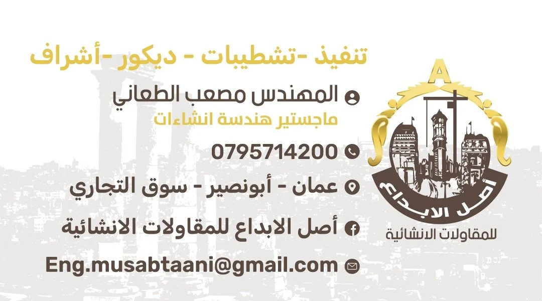 أصل الابداع للمقاولات الانشائية المهندس مصعب الطعاني هندسة مدنية بيهانس اتصال فيس بوك انستقرام عمان ، الاردن الخدمات المقدمة مؤسسة مقاولات متخصصة في تنفيذ أعمال العظم والتشطيبات، تقدم خدمات بناء وصيانة للمشاريع السكنية والتجارية وفق أعلى معايير الجودة والالتزام بالمواعيد.